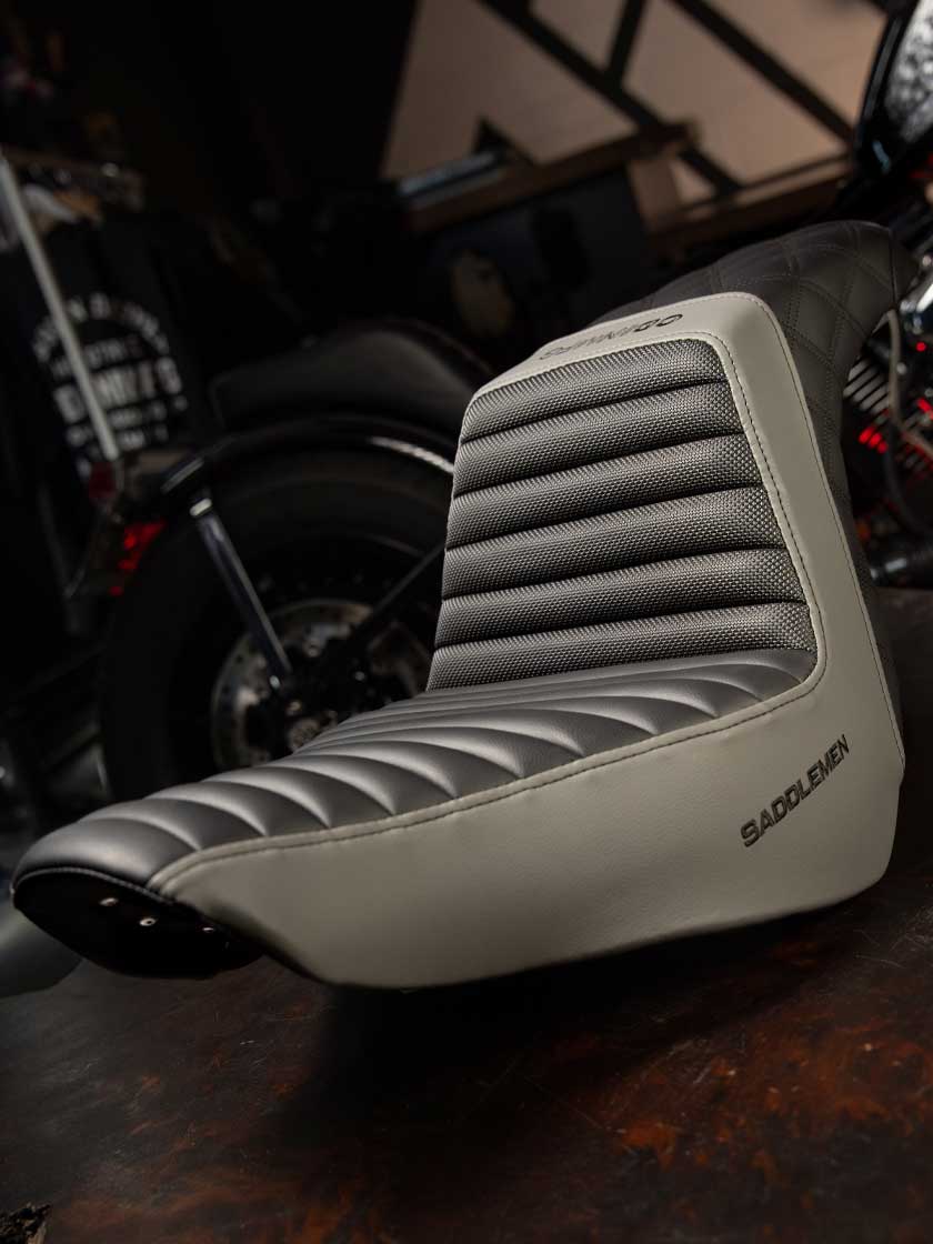 Score an awesome deal on an instock Saddlemen Seat. Featuring the tuck and roll design with grey band and black stitch with rear diamond cross-stitch pattern.