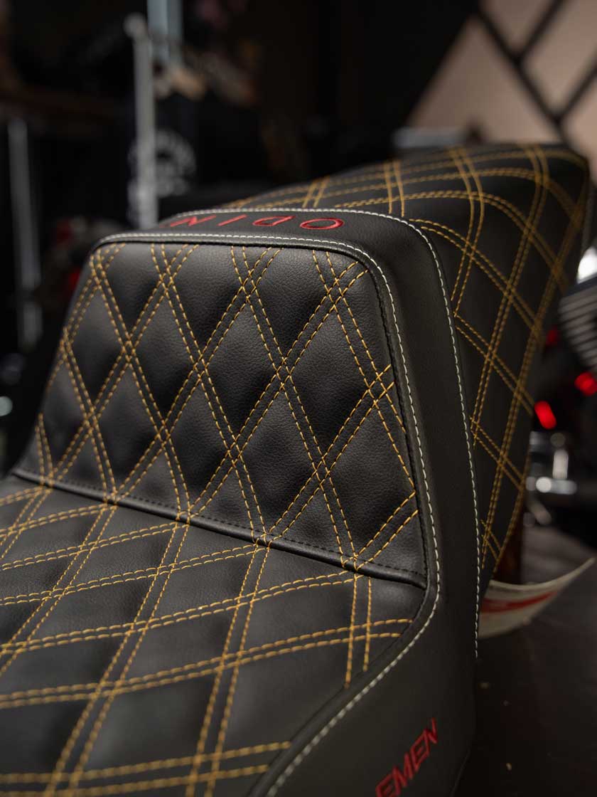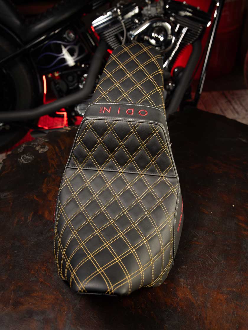 Score an awesome deal on an instock Saddlemen Seat. Featuring a yellow diamond stitch pattern on the front and rear with red Odin Mfg logo.