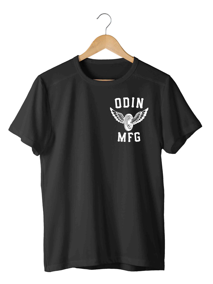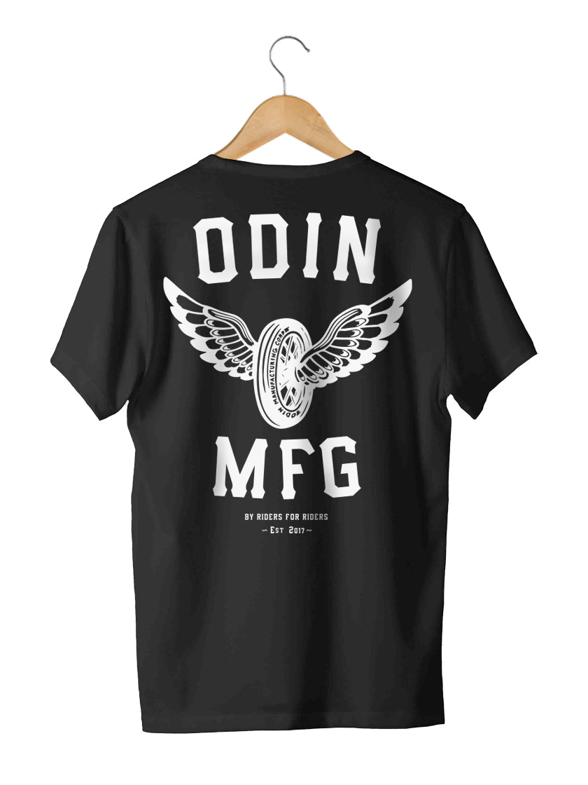 Another original black t-shirt design from Odin Mfg. A hand-drawn classic wing & wheel design with bold white print on a heavyweight black cotton t-shirt.