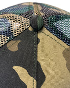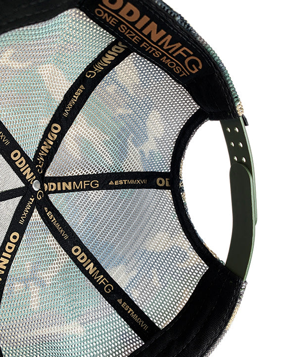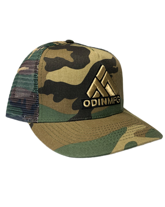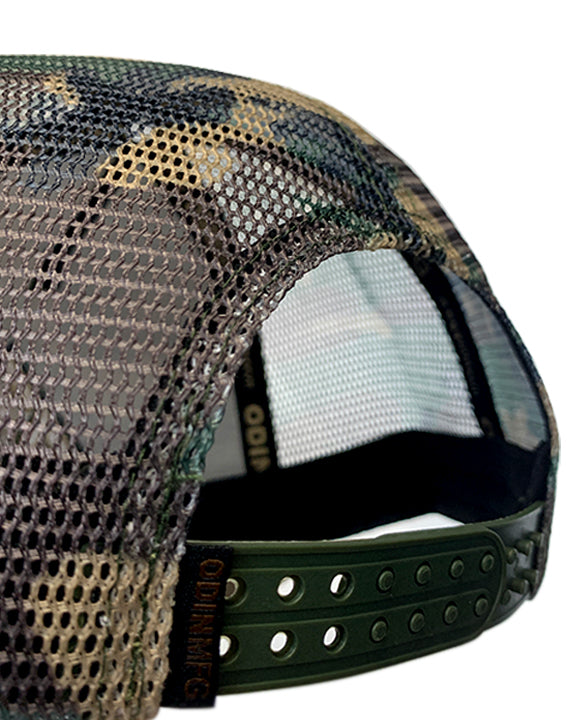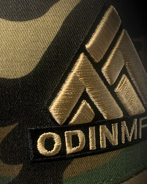 The Stacked Odin Logo puff embroidered on our M81 Woodland Camo meshback.