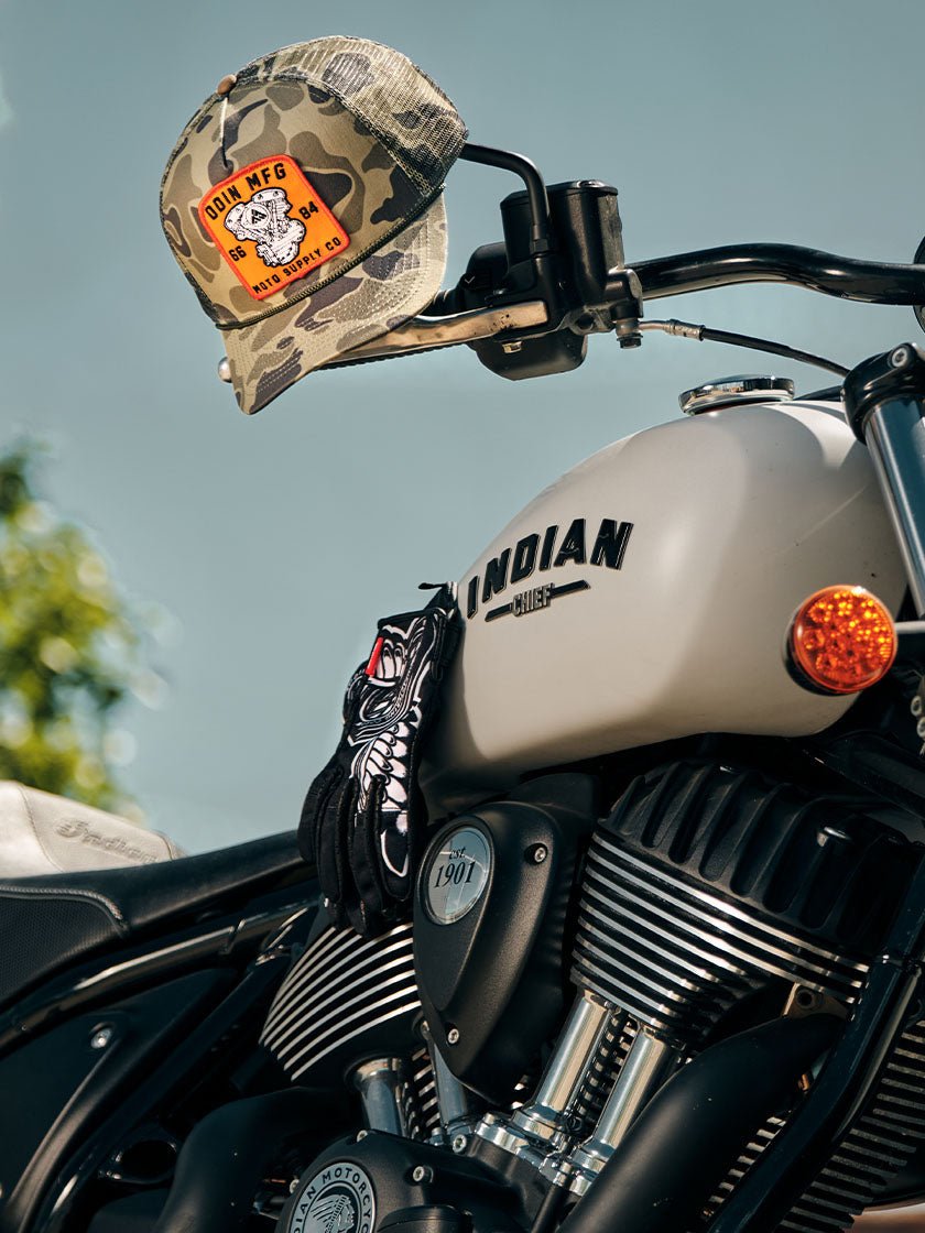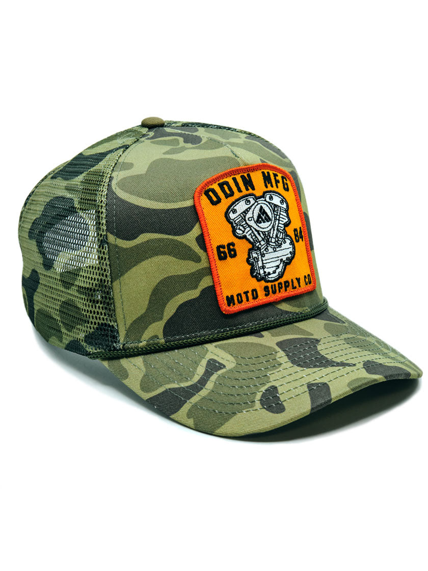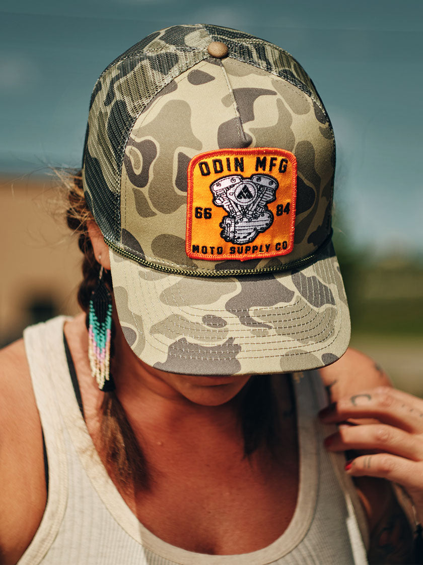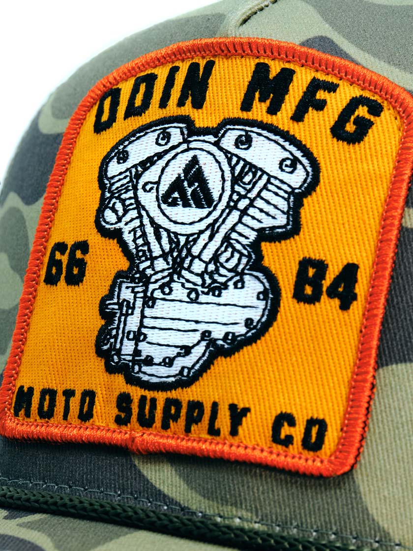 Featuring easy double-row snapback adjustability, the Moto Supply Meshback Hat adds a distinct style to any hat collection. It features the hand-drawn Shovel Head Engine art by Dwayne Wiebe a.k.a. Dweeb Designs. A talented artist, tattooer, pro snowboarder, and certified high miler.