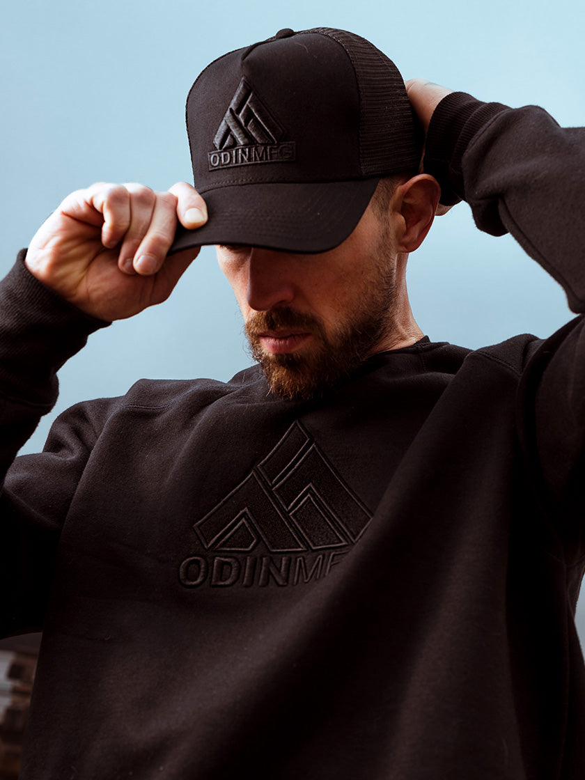 Our Stacked Odin Logo puff embroidered on a classic meshback. Subtle black on black with a premium fit and feel