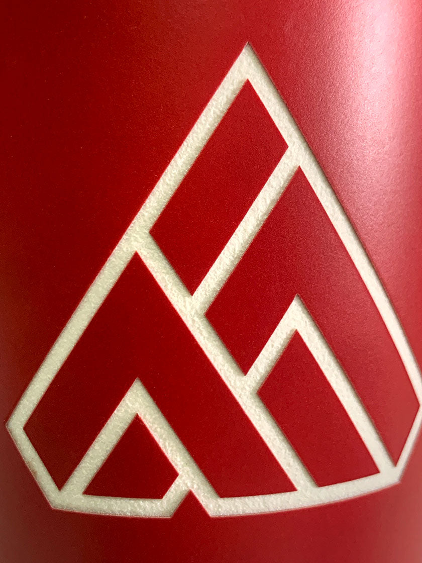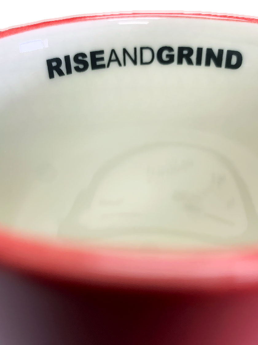 - Fully glazed matte red mug with etched Odin Diamond and internal graphics