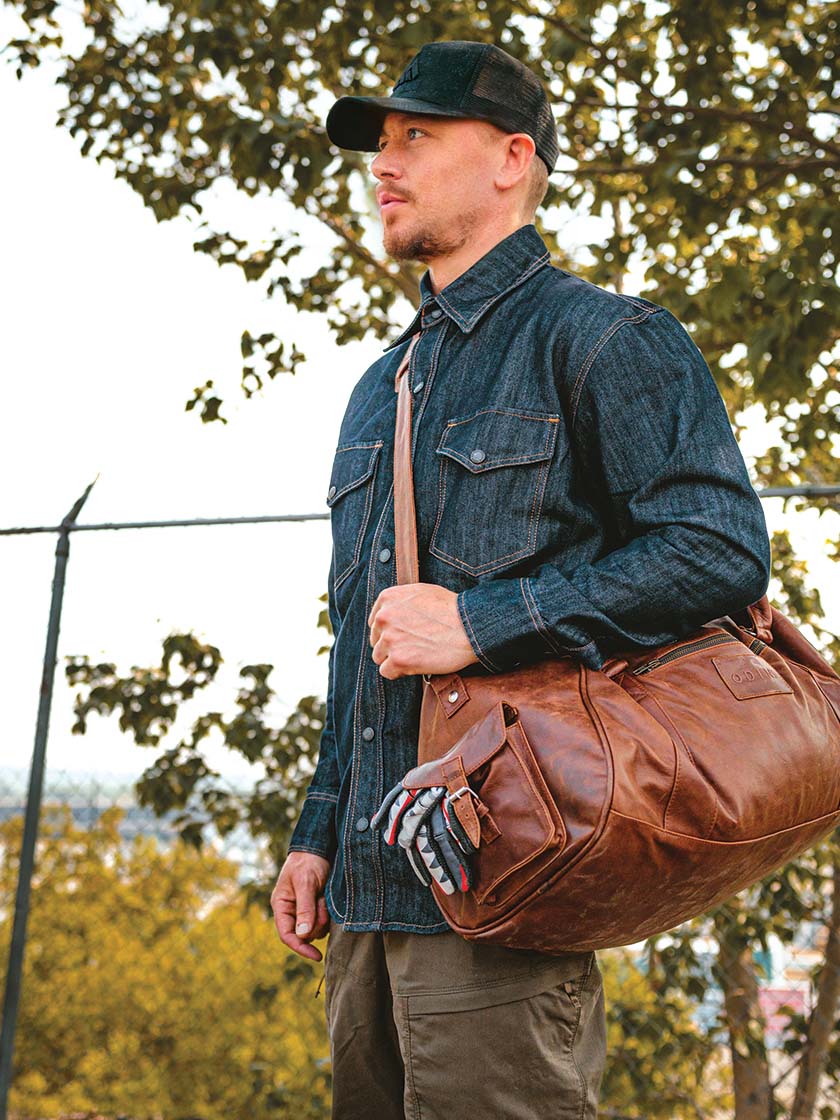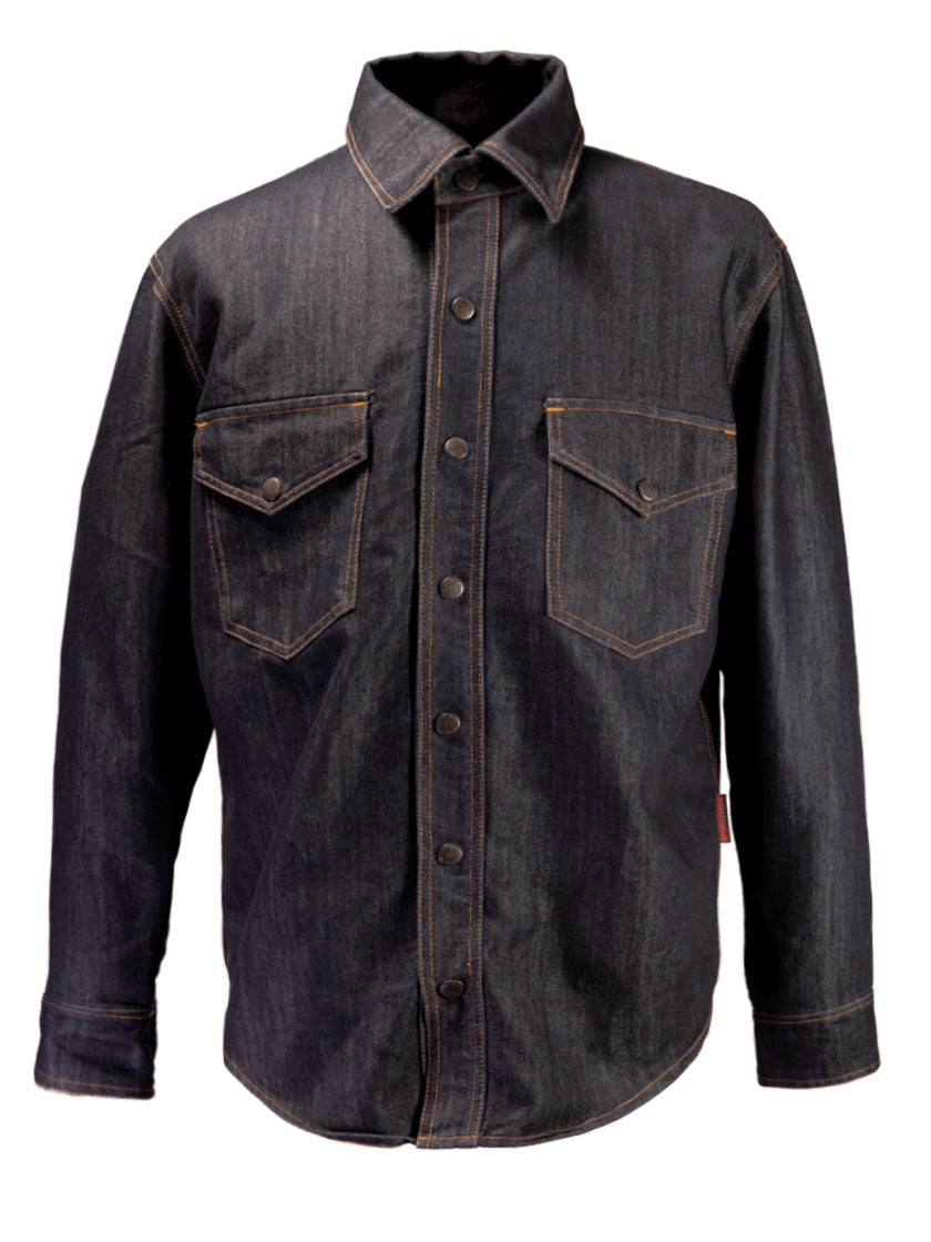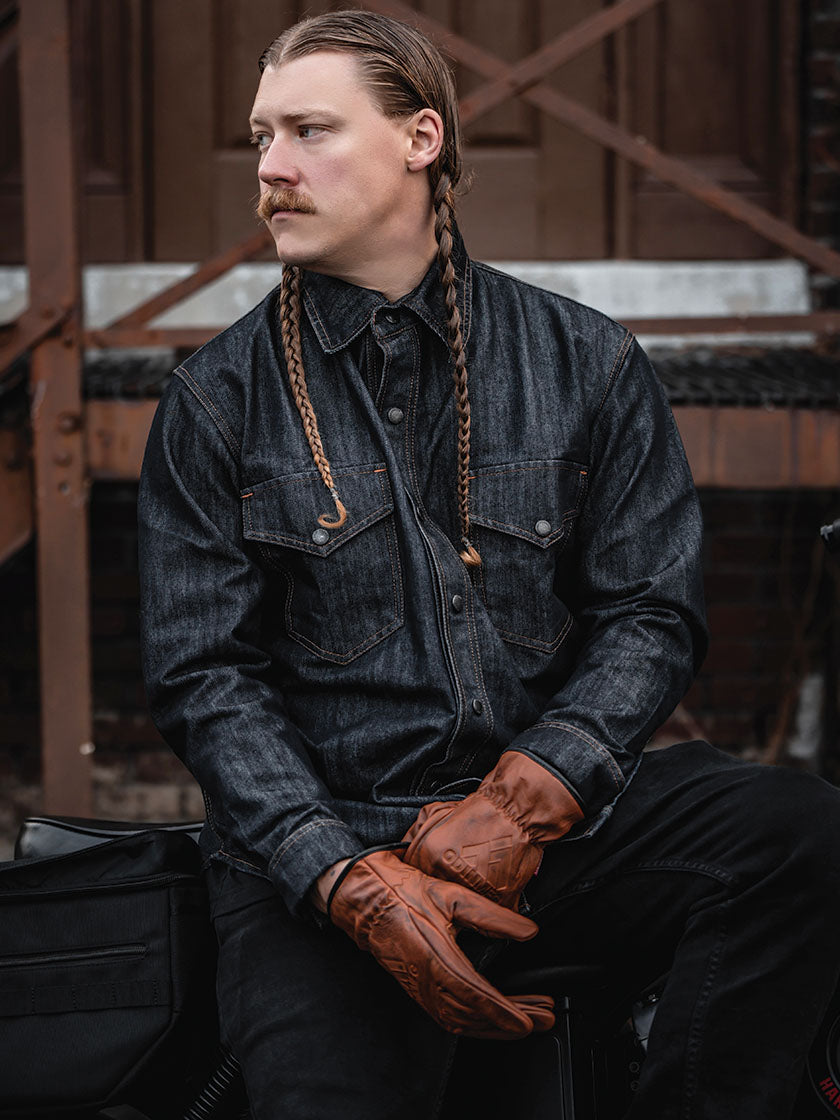 The Moto Supply riding shirt also features distressed brass snaps for easy on-and-off. Its pointed collar is a nod to the historical styling of denim shirts, while the double chest pockets with button closures offer convenient storage for small essentials such as keys or sunglasses.
