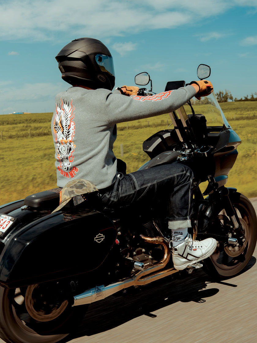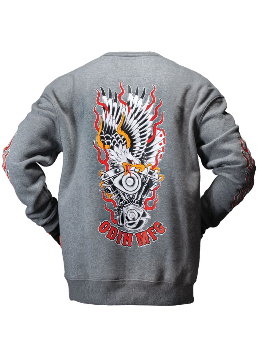 The Odin Mfg x Dweeb Designs Freedom Eagle Crewneck is a heavyweight fleece sweatshirt built for riders who want clean style with a heavy graphic punch. Featuring Odin sleeve flames, chest hit, and the Freedom Eagle + V-Twin engine back print designed by Dwayne Weibe, this crewneck blends everyday comfort with a bold outlaw edge. Perfect for cold rides, shop days, or late nights.